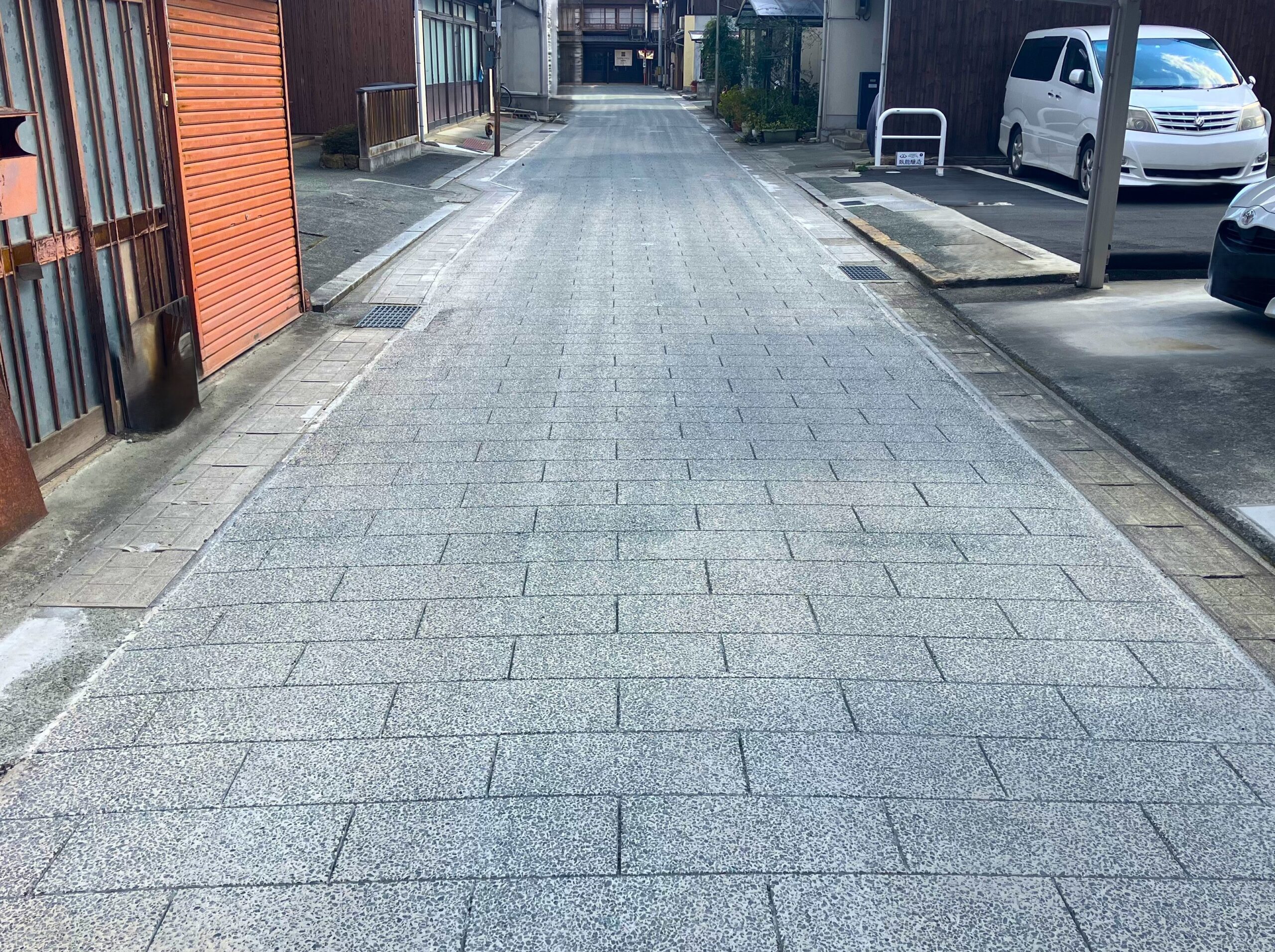 都市構造再編集中支援事業として、整備重点区域内の歴史的建造物を巡る道路を周辺景観に配慮した舗装とするため、石畳をイメージした石畳風舗装を施工しました。本石畳舗装には大洲市近隣で採取される輝緑岩を使用することで、風合いのある舗装となっています。